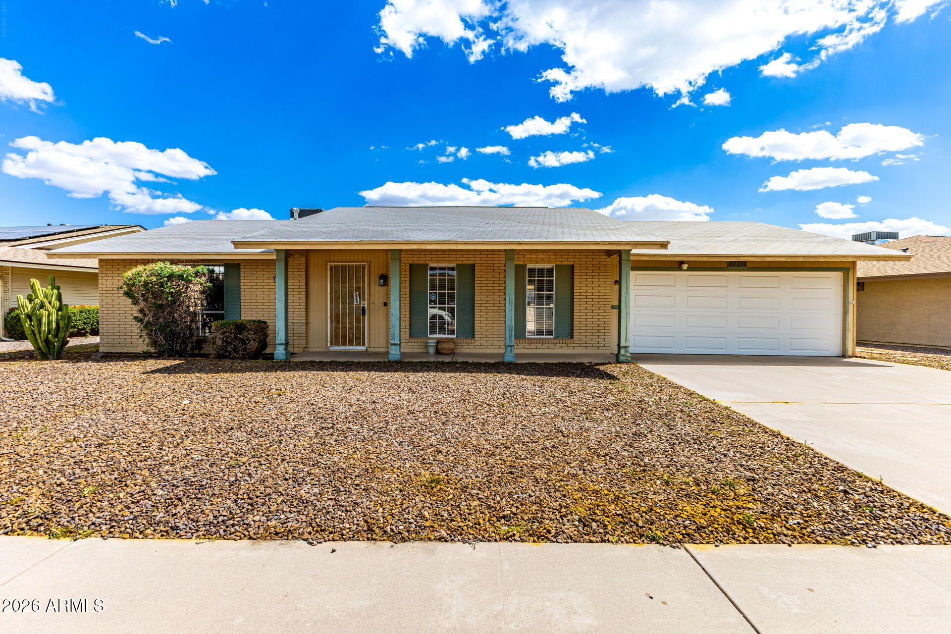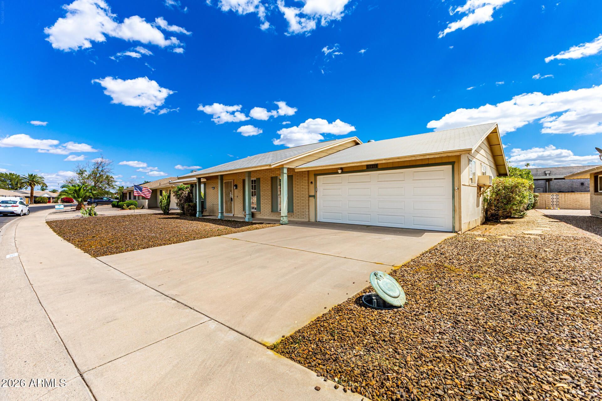 Enjoy vibrant adult living in Sun City! This lovely 2-bedroom, 2-bath residence features a 2-car garage and a low-maintenance desert landscape for maximum curb appeal with minimal upkeep. Inside, youll find a serene living/dining room with a soothing palette, blinds, and wood-look flooring. The well-appointed kitchen comes with flat-panel cabinets, built-in appliances, and a pantry for storing culinary essentials. The main bedroom includes soft carpeting and a private bathroom for added comfort. Unwind at the end of a long day in the sizeable backyard, which offers a spacious patio perfect for enjoying a good book or refreshing drinks. Dont miss your chance to own this charming home!